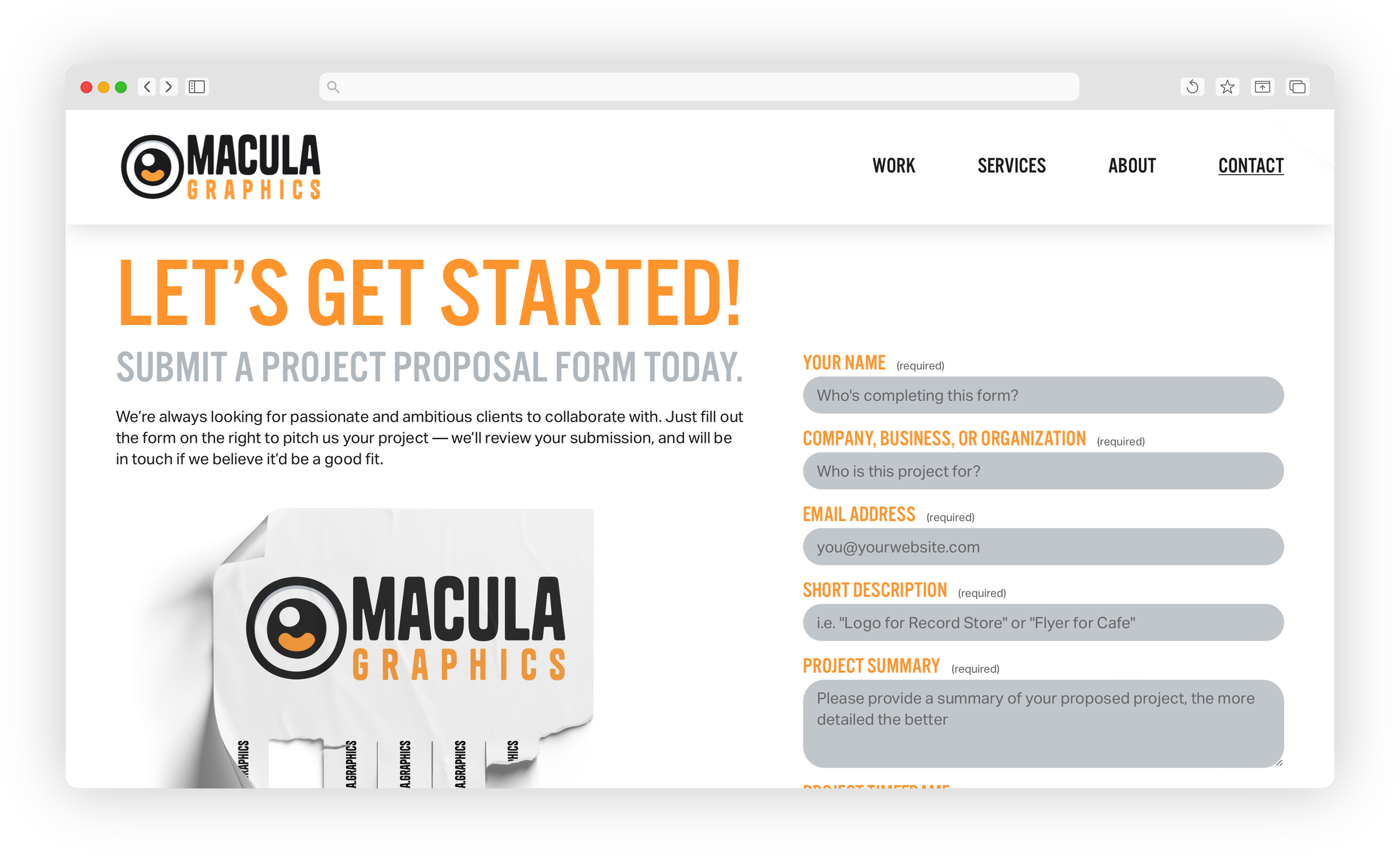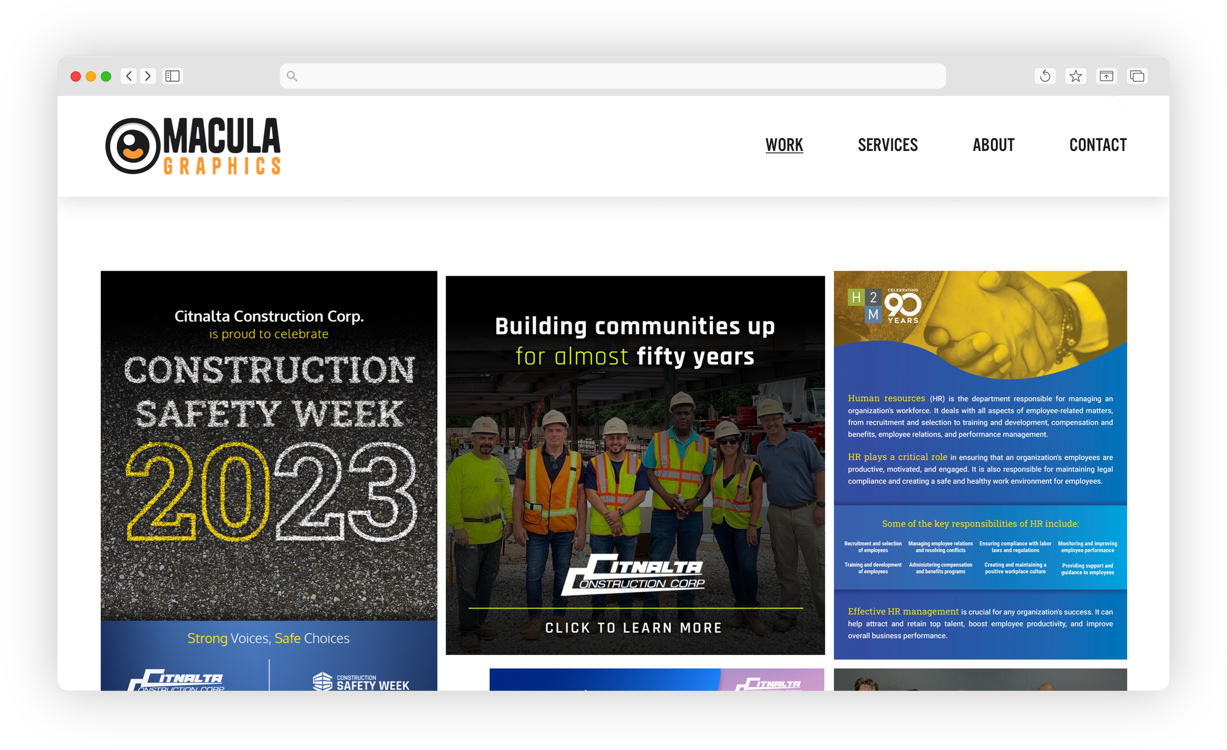 Above: desktop view of the Macula website’s Work page, featuring a lineup of relevant deliverables I had completed