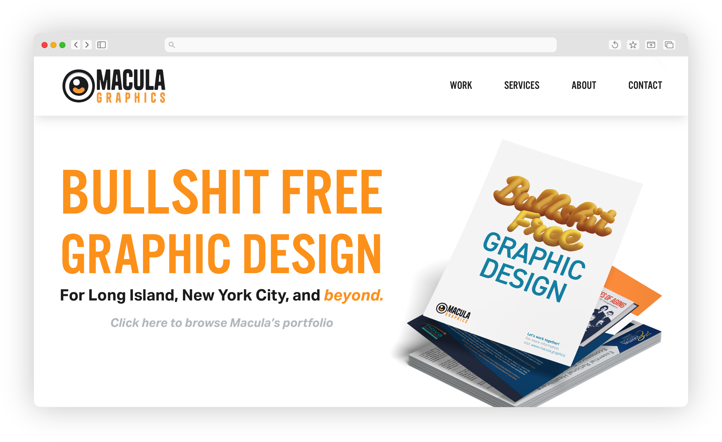 Above: desktop view of the Home page from Macula’s website, which showcases a branded print flyer design